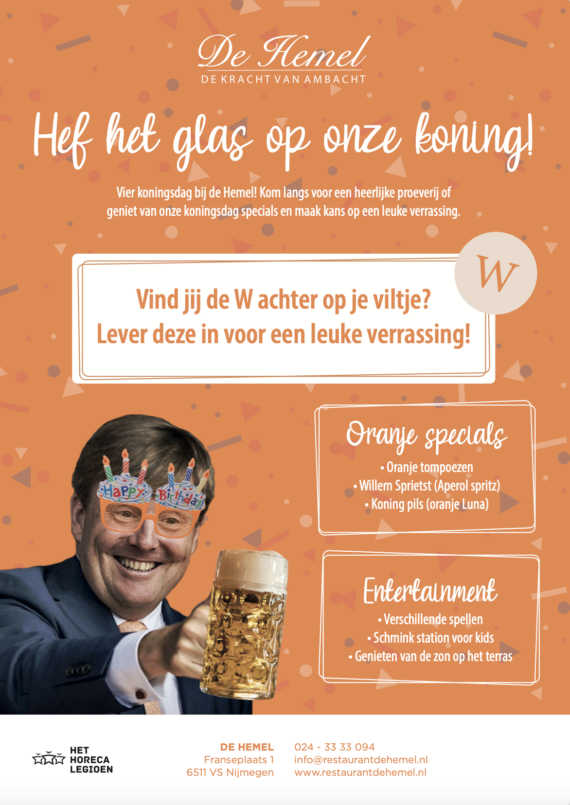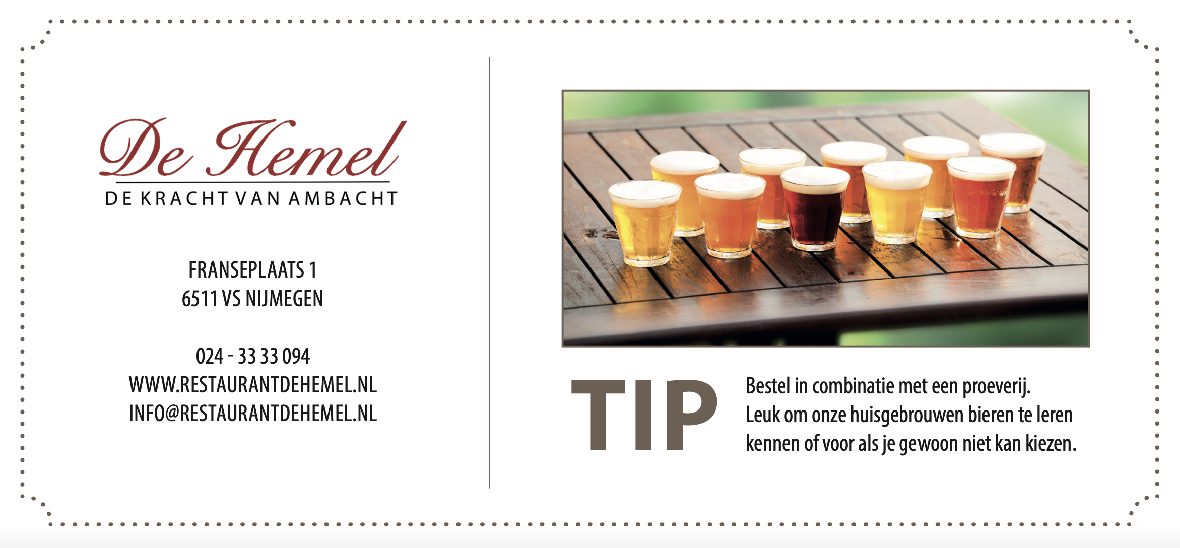 Restaurant De Hemel is gevestigd aan de Franseplaats in Nijmegen. Het restaurant bevindt zich in de Commanderie van Sint Jan, een historisch pand. Bij de hemel wordt ook bier gebrouwen en er zijn enkele suites waar je kunt overnachten. Hieronder zie je enkele uitingen die ik voor de Hemel heb vormgegeven.