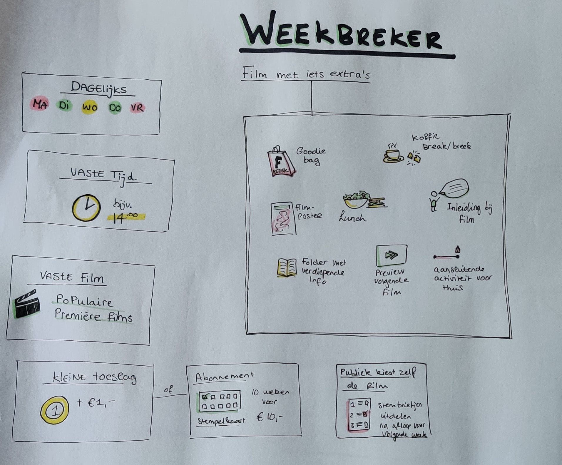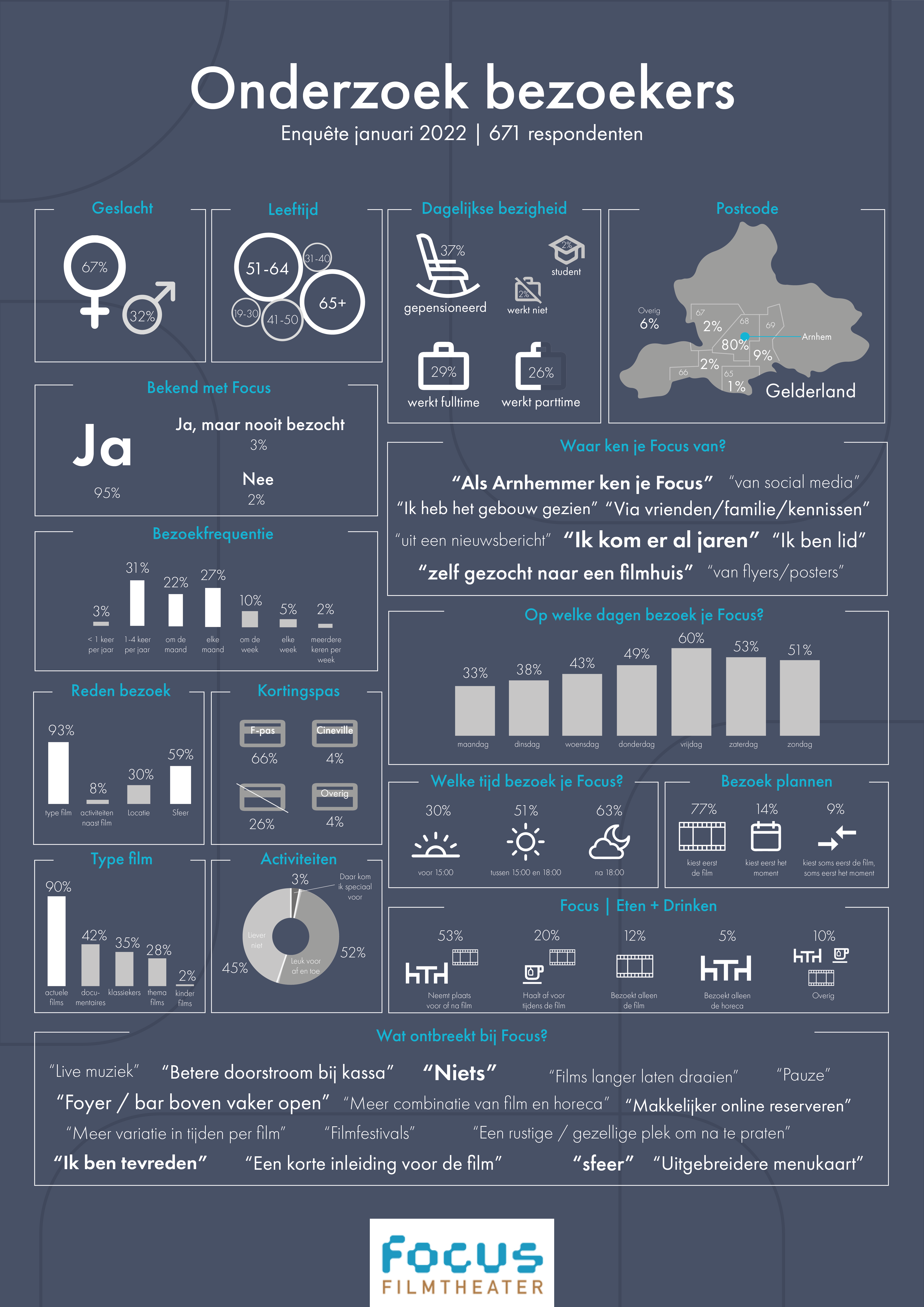 Om mijn opleiding af te kunnen ronden moest ik een half jaar stage lopen bij een bedrijf en daar zelfstandig een project uitvoeren. Ik liep mijn stage bij Focus Filmtheater in Arnhem. Hier kreeg ik de opdracht om een oplossing te zoeken voor het probleem dat er gedurende de daluren wel heel weinig bezoekers naar het filmtheater kwamen. Ik deed onderzoek, bedacht een concept en zette een eerste aanzet tot het ontwerpen van communicatiemiddelen. Hieronder vind je mijn projectverslag en enkele uitwerkingen die ik tijdens dit project heb gemaakt.