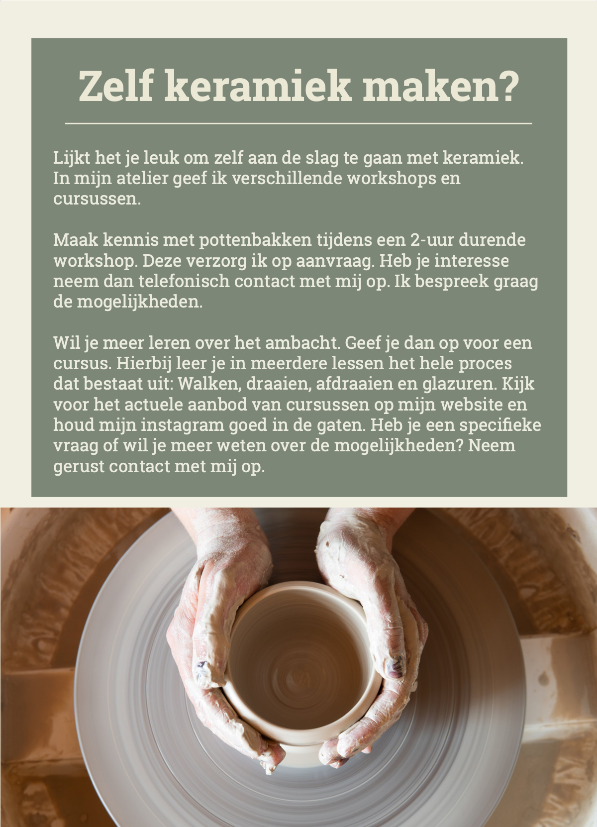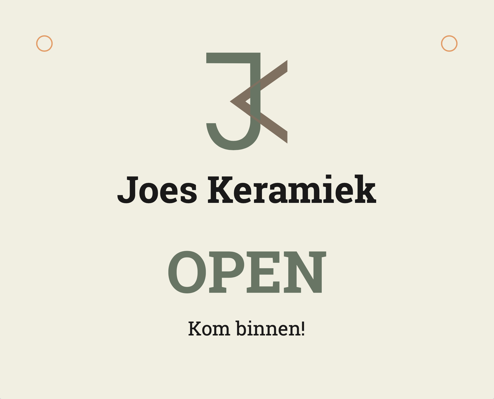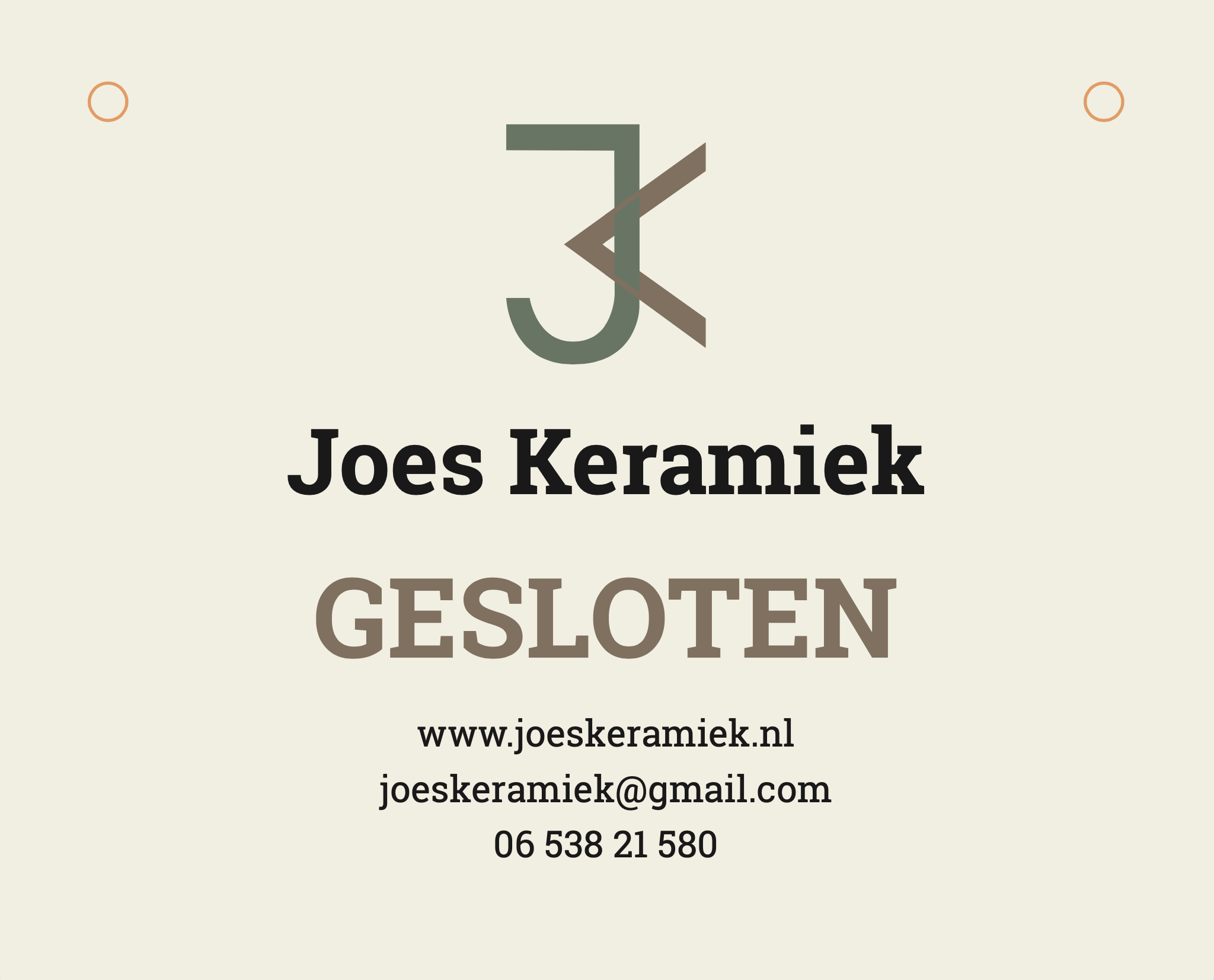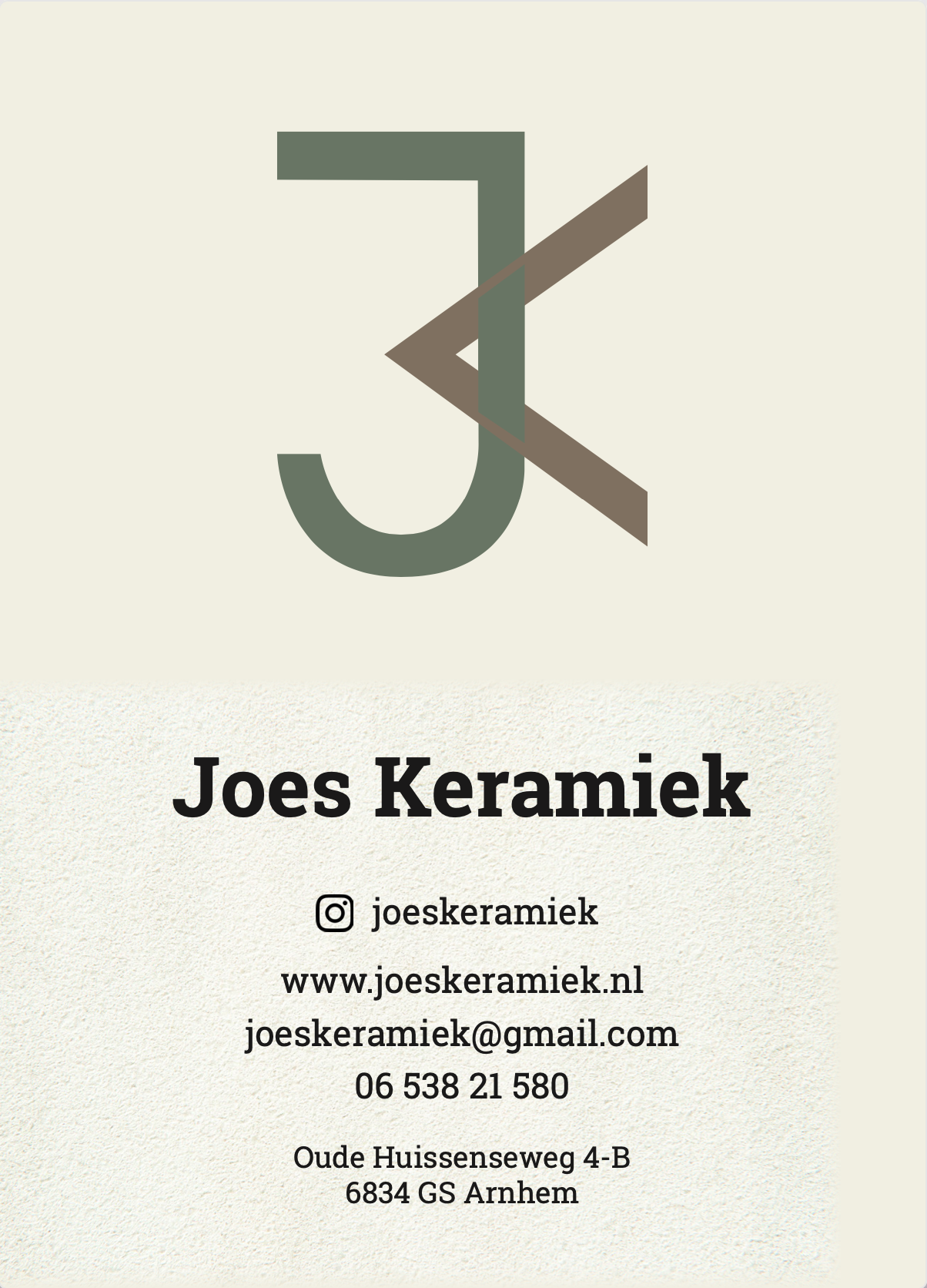 Joes Keramiek Ik heb verschillende visuele uitingen voor Joes Keramiek gemaakt. Zo heb ik onder andere de website in elkaar gezet, flyers ontworpen en foto’s gemaakt. Hieronder zie je mijn werk. Website Flyer Bord ingang